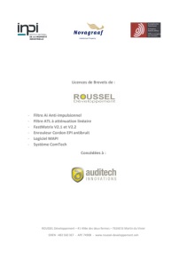 Licences de Brevets de : ‐ Filtre Ai Anti‐impulsionnel ‐ Filtre ATL à atténuation linéaire ‐ FastMatrix V2.1 et V2.2 ‐ Enrouleur Cordon EPI antibruit ‐ Logiciel MAPI ‐ Système ComTech Concédées à : ROUSSEL Développement – 41 Allée des deux fermes – 76160 St Martin du Vivier SIREN : 483 560 367 ‐ APE 7490B ‐ www.roussel‐developpement.ovh